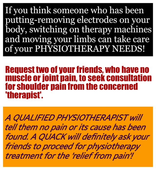 Do not fall prey to the hands of low priced quacks posing as physiotherapists. You may not be able to recover from the damage they do to your physical functional abilities!