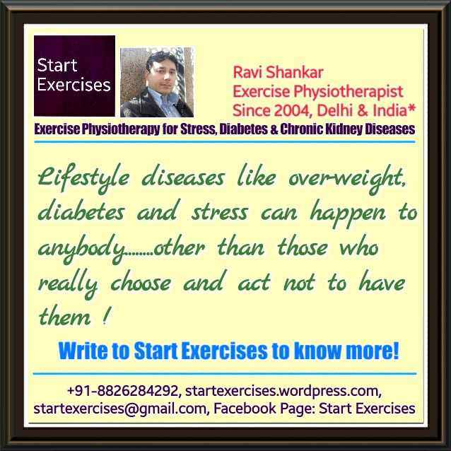 Lifestyle Health Problems: Choose to Have or to Not Have Them! 15 Oct 2017 Ravi Shankar - CEO, Physical Rehab Business Consultant (India) Personal routine of work, diet, relaxations, sleep and recreation- if balanced appropriately, can help avoid lifestyle health issues! Exercises do play a vital role in optimizing the physiological health of any person. Write to startexercises@gmail.com to know more!