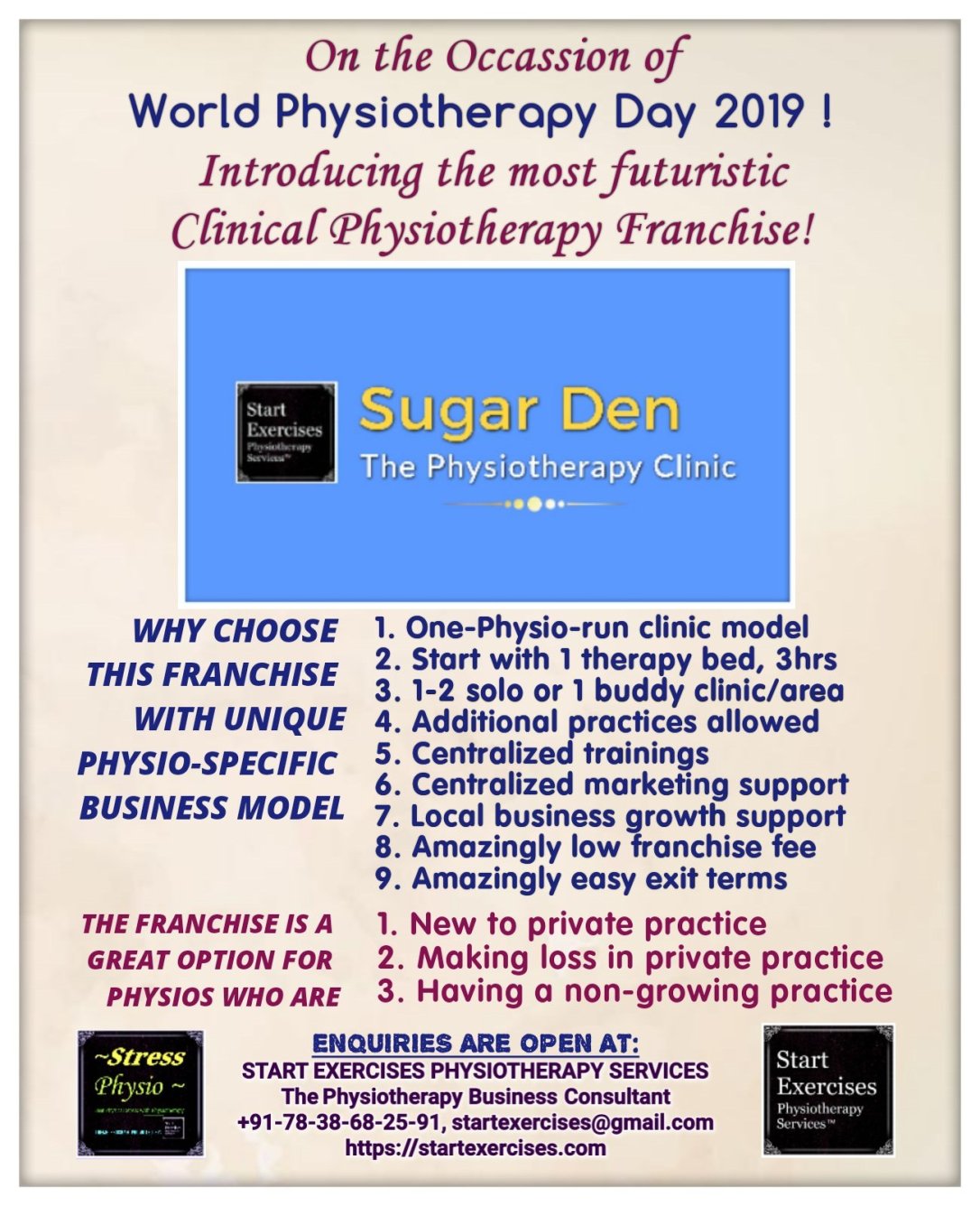 On World Physiotherapy Day, 2019, Start Exercises Physiotherapy Services has opened franchising enquiries for its revolutionary chain of physiotherapy clinics – Sugar Den.