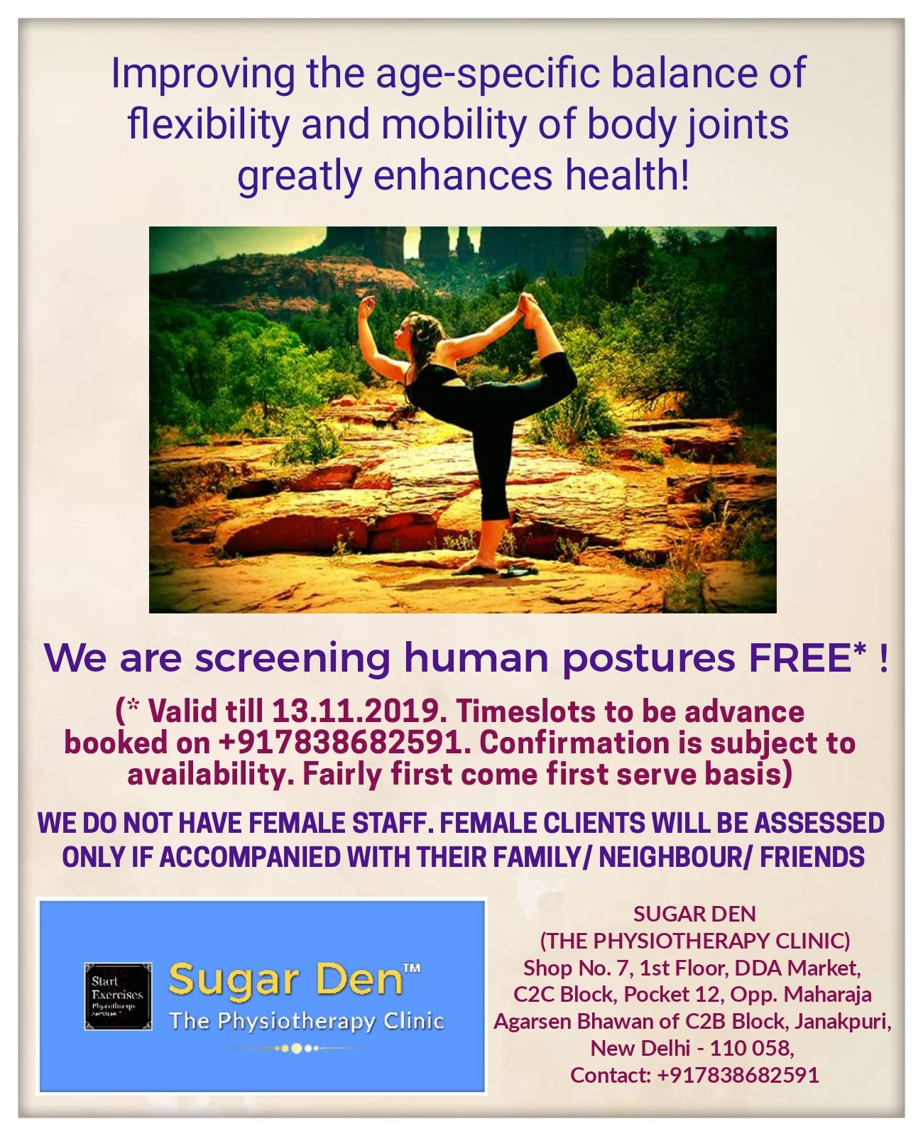 Free posture assessment for screening joint flexibility and mobility till 13.11.2019, at Sugar Den- The Physiotherapy Clinic, opposite Maharaja Agrasen Bhawan, Block C2B, at Janakpuri, in West Delhi.