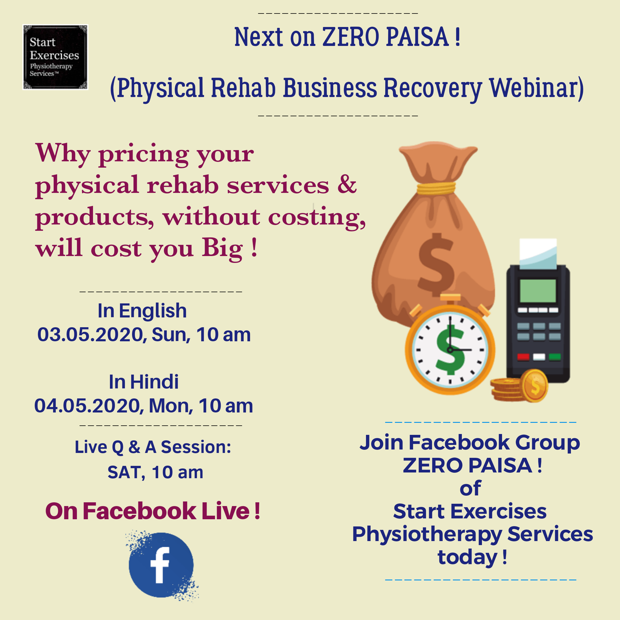 Zero Paisa is India’s daily physical rehab business coaching webinar on Facebook Live.