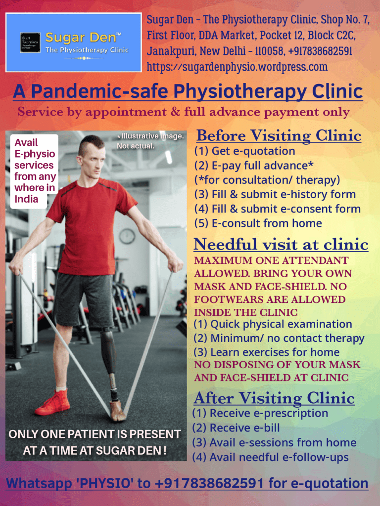 Patients can whatsapp ‘PHYSIO’ to +917838682591, to receive e-quotation, so as to initiate their preventive or rehabilitative physiotherapy with Sugar Den, The Physiotherapy Clinic at Janakpuri, West Delhi, Delhi