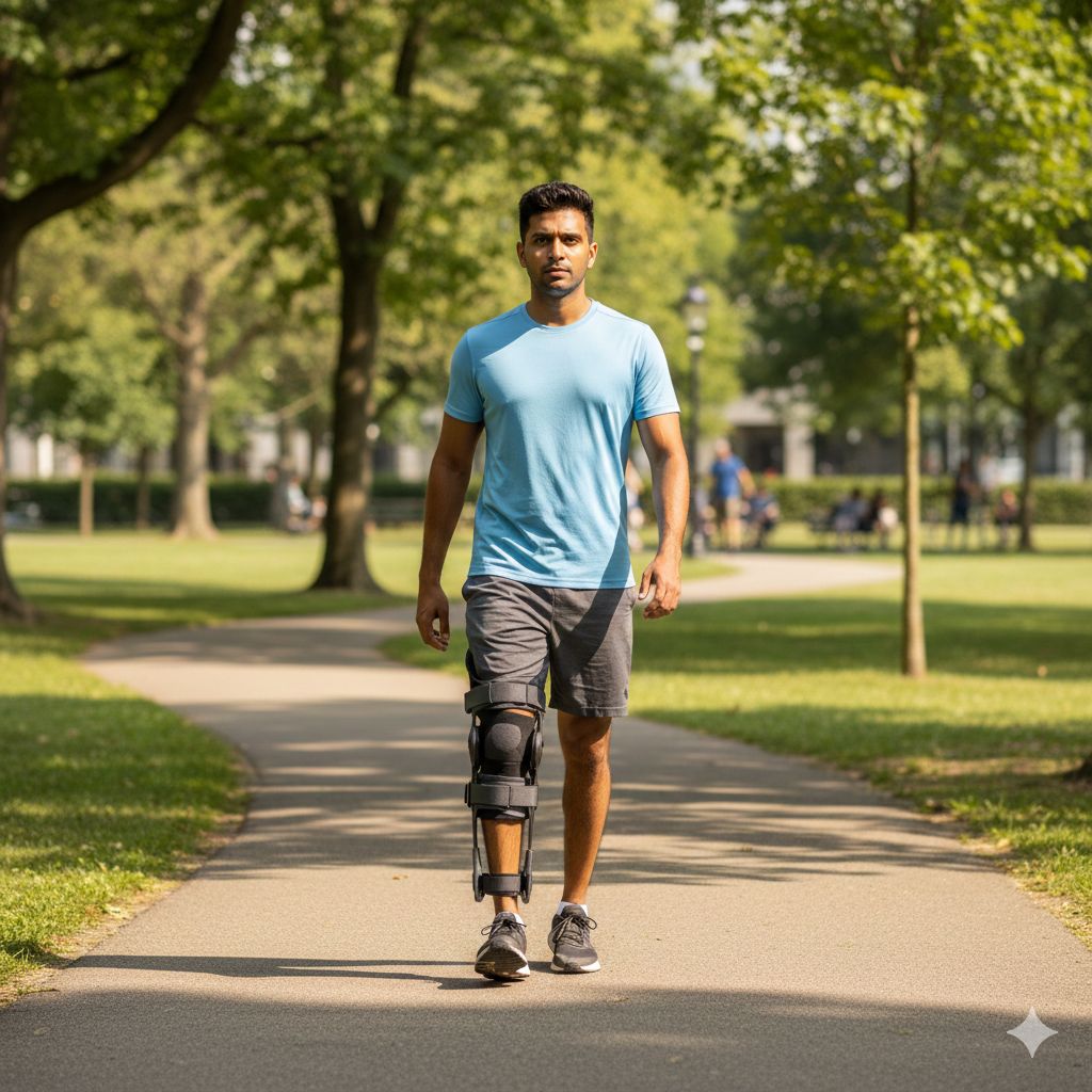 “You are wearing a two-bar knee brace and not a knee cap, which means bearing full weight of your body on that knee is not allowed during walking.”